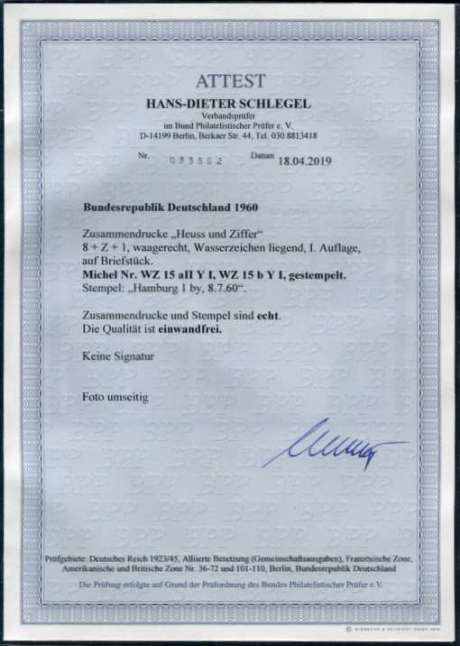 Bund ZDR WZ 15 aII YI gestempelt, Oberrand + WZ15b YI gestempelt auf Briefstück mit FA Schlegel
